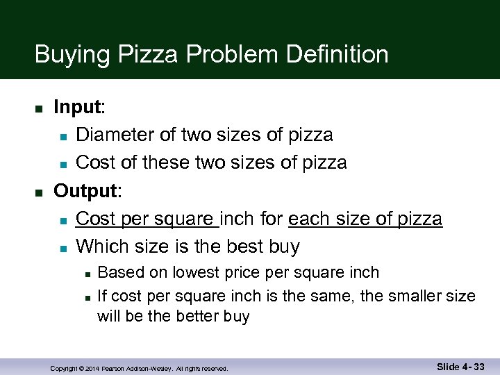 Buying Pizza Problem Definition n n Input: n Diameter of two sizes of pizza n Cost of these two sizes of pizza Output: n Cost per square inch for each size of pizza n Which size is the best buy n n Based on lowest price per square inch If cost per square inch is the same, the smaller size will be the better buy Copyright © 2014 Pearson Addison-Wesley. All rights reserved. Slide 4 - 33