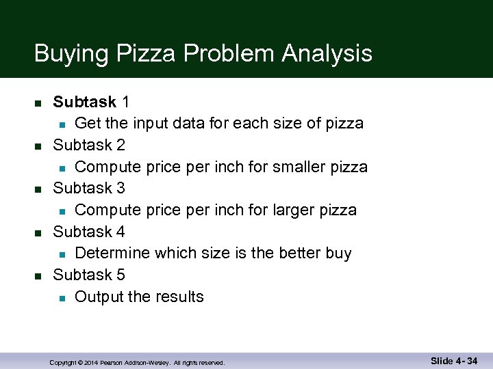 Buying Pizza Problem Analysis n n n Subtask 1 n Get the input data for each size of pizza Subtask 2 n Compute price per inch for smaller pizza Subtask 3 n Compute price per inch for larger pizza Subtask 4 n Determine which size is the better buy Subtask 5 n Output the results Copyright © 2014 Pearson Addison-Wesley. All rights reserved. Slide 4 - 34
