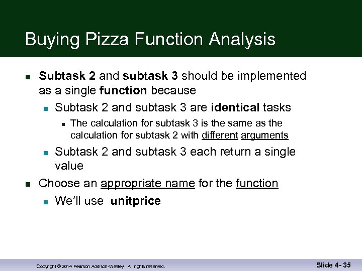 Buying Pizza Function Analysis n Subtask 2 and subtask 3 should be implemented as a single function because n Subtask 2 and subtask 3 are identical tasks n The calculation for subtask 3 is the same as the calculation for subtask 2 with different arguments Subtask 2 and subtask 3 each return a single value Choose an appropriate name for the function n We’ll use unitprice n n Copyright © 2014 Pearson Addison-Wesley. All rights reserved. Slide 4 - 35