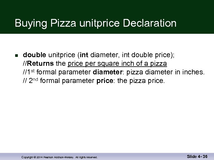 Buying Pizza unitprice Declaration n double unitprice (int diameter, int double price); //Returns the price per square inch of a pizza //1 st formal parameter diameter: pizza diameter in inches. // 2 nd formal parameter price: the pizza price. Copyright © 2014 Pearson Addison-Wesley. All rights reserved. Slide 4 - 36