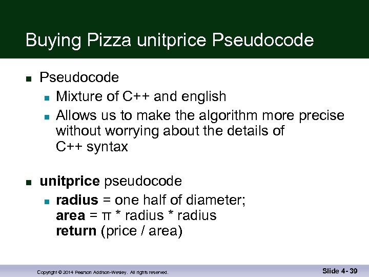 Buying Pizza unitprice Pseudocode n n Pseudocode n Mixture of C++ and english n Allows us to make the algorithm more precise without worrying about the details of C++ syntax unitprice pseudocode n radius = one half of diameter; area = π * radius return (price / area) Copyright © 2014 Pearson Addison-Wesley. All rights reserved. Slide 4 - 39