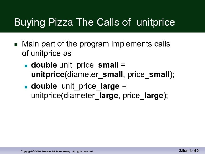 Buying Pizza The Calls of unitprice n Main part of the program implements calls of unitprice as n double unit_price_small = unitprice(diameter_small, price_small); n double unit_price_large = unitprice(diameter_large, price_large); Copyright © 2014 Pearson Addison-Wesley. All rights reserved. Slide 4 - 40