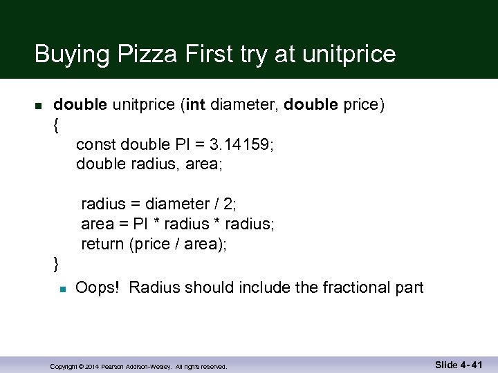 Buying Pizza First try at unitprice n double unitprice (int diameter, double price) { const double PI = 3. 14159; double radius, area; radius = diameter / 2; area = PI * radius; return (price / area); } n Oops! Radius should include the fractional part Copyright © 2014 Pearson Addison-Wesley. All rights reserved. Slide 4 - 41