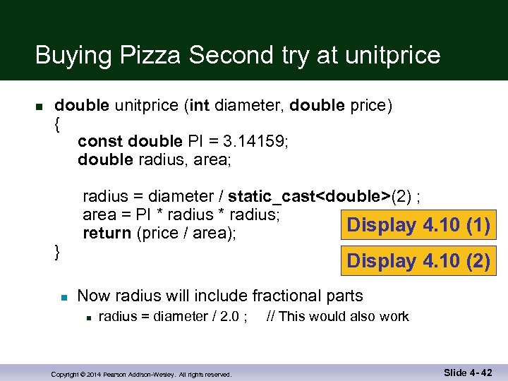 Buying Pizza Second try at unitprice n double unitprice (int diameter, double price) { const double PI = 3. 14159; double radius, area; radius = diameter / static_cast<double>(2) ; area = PI * radius; Display 4. 10 (1) return (price / area); } Display 4. 10 (2) n Now radius will include fractional parts n radius = diameter / 2. 0 ; Copyright © 2014 Pearson Addison-Wesley. All rights reserved. // This would also work Slide 4 - 42