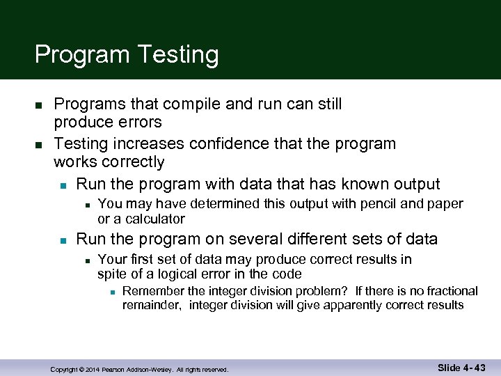 Program Testing n n Programs that compile and run can still produce errors Testing increases confidence that the program works correctly n Run the program with data that has known output n n You may have determined this output with pencil and paper or a calculator Run the program on several different sets of data n Your first set of data may produce correct results in spite of a logical error in the code n Remember the integer division problem? If there is no fractional remainder, integer division will give apparently correct results Copyright © 2014 Pearson Addison-Wesley. All rights reserved. Slide 4 - 43