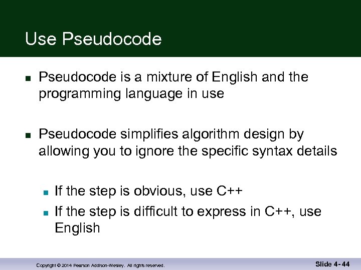 Use Pseudocode n n Pseudocode is a mixture of English and the programming language in use Pseudocode simplifies algorithm design by allowing you to ignore the specific syntax details n n If the step is obvious, use C++ If the step is difficult to express in C++, use English Copyright © 2014 Pearson Addison-Wesley. All rights reserved. Slide 4 - 44