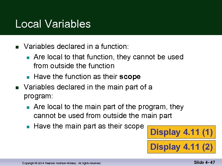 Local Variables n n Variables declared in a function: n Are local to that function, they cannot be used from outside the function n Have the function as their scope Variables declared in the main part of a program: n Are local to the main part of the program, they cannot be used from outside the main part n Have the main part as their scope Display 4. 11 (1) Display 4. 11 (2) Copyright © 2014 Pearson Addison-Wesley. All rights reserved. Slide 4 - 47