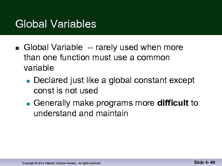Global Variables n Global Variable -- rarely used when more than one function must use a common variable n Declared just like a global constant except const is not used n Generally make programs more difficult to understand maintain Copyright © 2014 Pearson Addison-Wesley. All rights reserved. Slide 4 - 49