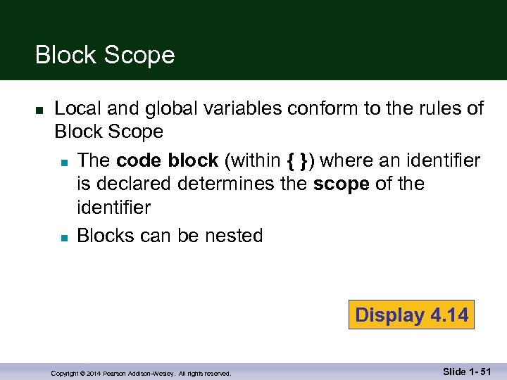 Block Scope n Local and global variables conform to the rules of Block Scope n The code block (within { }) where an identifier is declared determines the scope of the identifier n Blocks can be nested Display 4. 14 Copyright © 2014 Pearson Addison-Wesley. All rights reserved. Slide 1 - 51