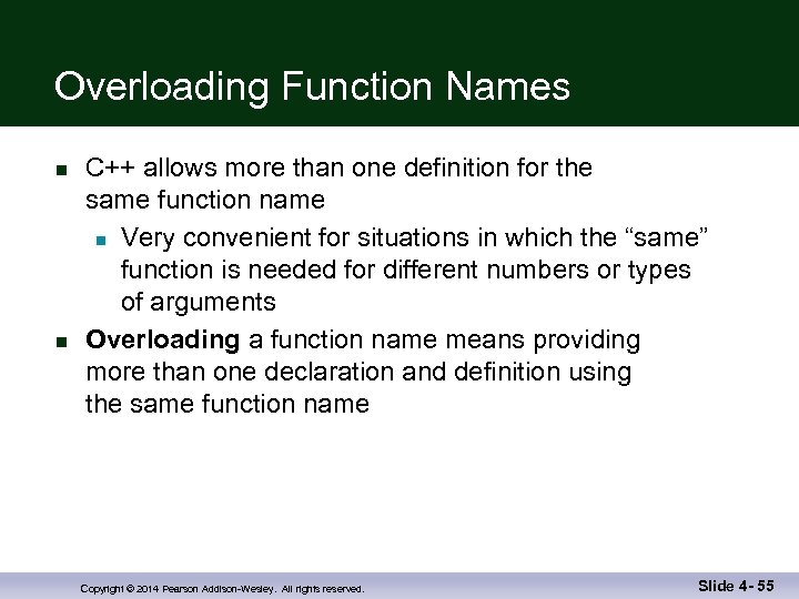 Overloading Function Names n n C++ allows more than one definition for the same function name n Very convenient for situations in which the “same” function is needed for different numbers or types of arguments Overloading a function name means providing more than one declaration and definition using the same function name Copyright © 2014 Pearson Addison-Wesley. All rights reserved. Slide 4 - 55