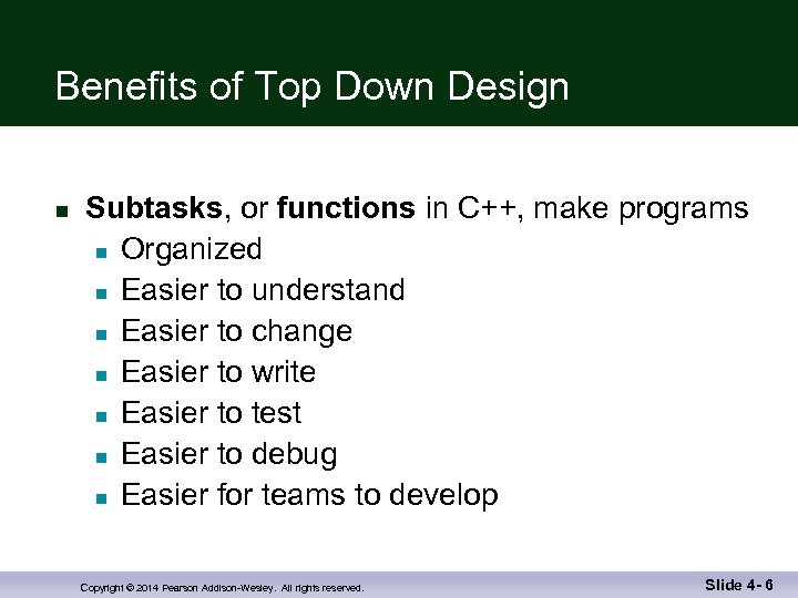 Benefits of Top Down Design n Subtasks, or functions in C++, make programs n Organized n Easier to understand n Easier to change n Easier to write n Easier to test n Easier to debug n Easier for teams to develop Copyright © 2014 Pearson Addison-Wesley. All rights reserved. Slide 4 - 6