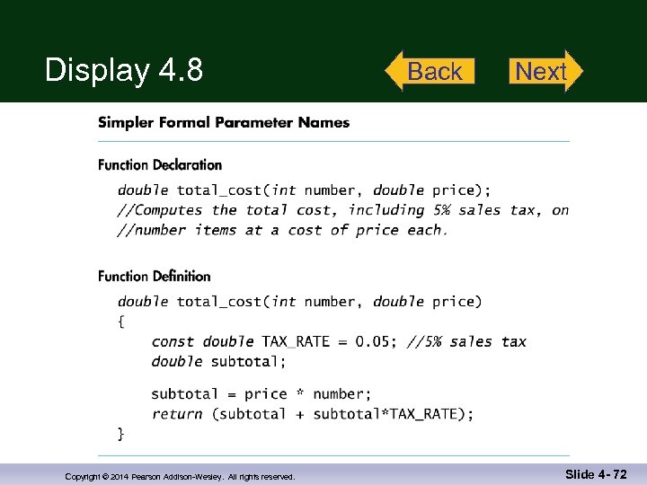 Display 4. 8 Copyright © 2014 Pearson Addison-Wesley. All rights reserved. Back Next Slide 4 - 72