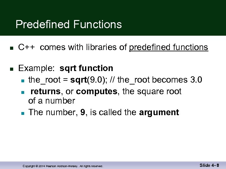 Predefined Functions n n C++ comes with libraries of predefined functions Example: sqrt function n the_root = sqrt(9. 0); // the_root becomes 3. 0 n returns, or computes, the square root of a number n The number, 9, is called the argument Copyright © 2014 Pearson Addison-Wesley. All rights reserved. Slide 4 - 8