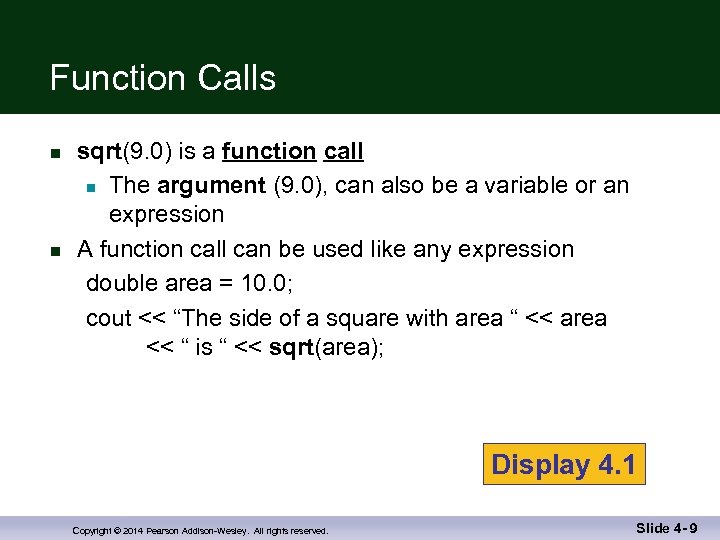 Function Calls n n sqrt(9. 0) is a function call n The argument (9. 0), can also be a variable or an expression A function call can be used like any expression double area = 10. 0; cout << “The side of a square with area “ << area << “ is “ << sqrt(area); Display 4. 1 Copyright © 2014 Pearson Addison-Wesley. All rights reserved. Slide 4 - 9