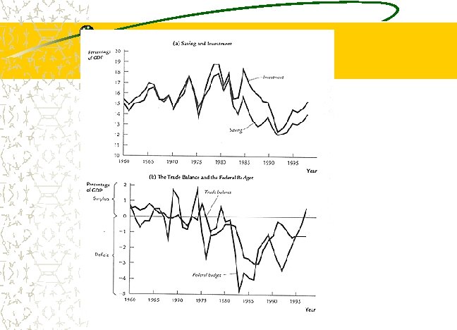 Twin Deficits The federal budget deficit (G>T), reduces national savings (S = Y – C – G) Reduced national savings foreign capital inflow, hence causing a trade deficit (NX<0) So, budget deficit causes trade deficit
