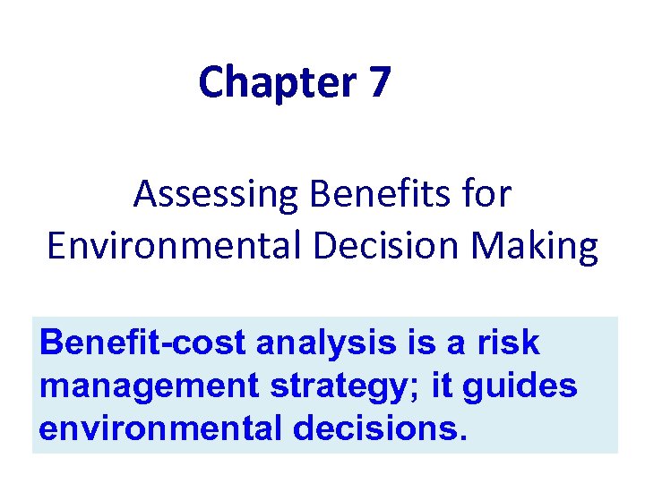 Chapter 7 Assessing Benefits for Environmental Decision Making Benefit-cost analysis is a risk management strategy; it guides environmental decisions.