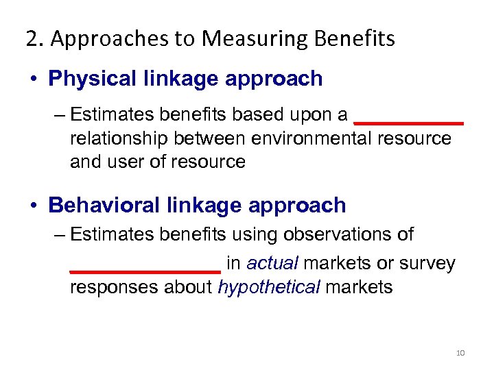 2. Approaches to Measuring Benefits • Physical linkage approach – Estimates benefits based upon a ____ relationship between environmental resource and user of resource • Behavioral linkage approach – Estimates benefits using observations of ______ in actual markets or survey responses about hypothetical markets 10