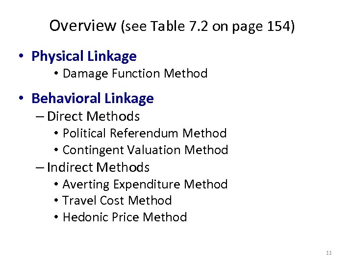 Overview (see Table 7. 2 on page 154) • Physical Linkage • Damage Function Method • Behavioral Linkage – Direct Methods • Political Referendum Method • Contingent Valuation Method – Indirect Methods • Averting Expenditure Method • Travel Cost Method • Hedonic Price Method 11
