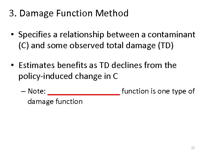 3. Damage Function Method • Specifies a relationship between a contaminant (C) and some observed total damage (TD) • Estimates benefits as TD declines from the policy-induced change in C – Note: _______ function is one type of damage function 12