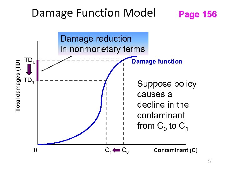 Damage Function Model Page 156 Total damages (TD) Damage reduction in nonmonetary terms TD 0 Damage function TD 1 0 Suppose policy causes a decline in the contaminant from C 0 to C 1 C 0 Contaminant (C) 13