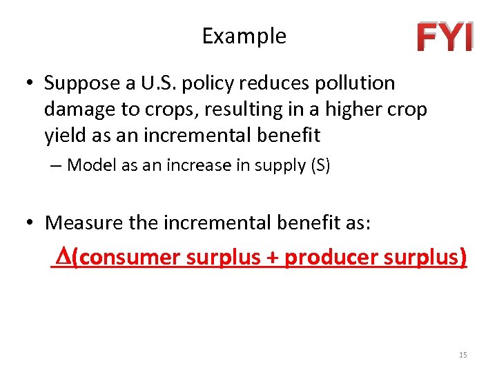 Example FYI • Suppose a U. S. policy reduces pollution damage to crops, resulting in a higher crop yield as an incremental benefit – Model as an increase in supply (S) • Measure the incremental benefit as: (consumer surplus + producer surplus) 15