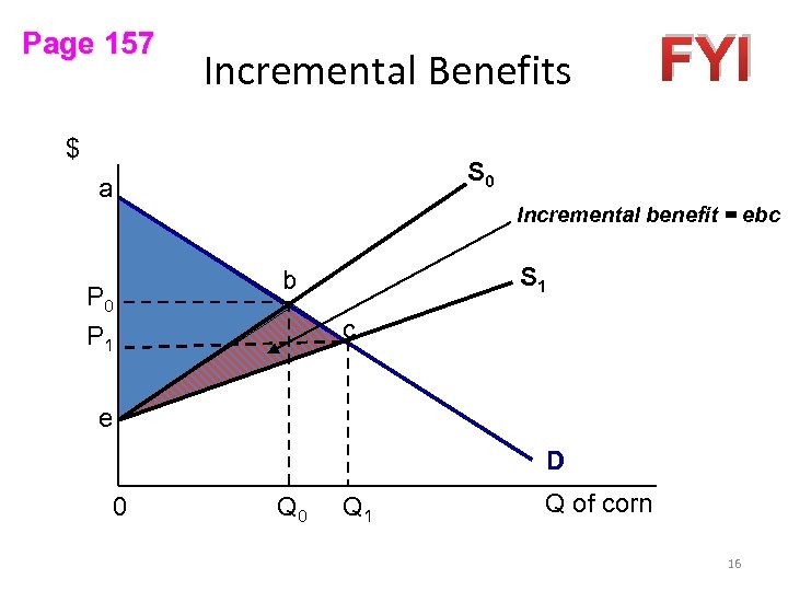 Page 157 Incremental Benefits $ S 0 a P 0 P 1 FYI Incremental benefit = ebc S 1 b c e D 0 Q 1 Q of corn 16