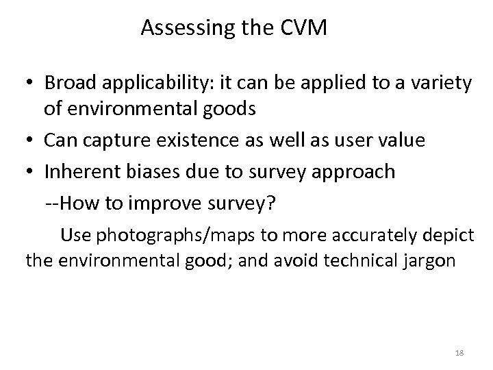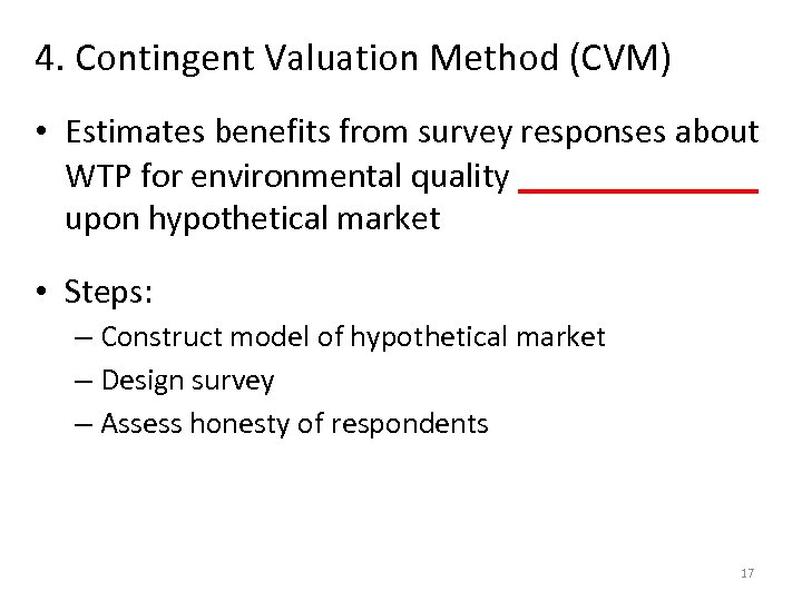4. Contingent Valuation Method (CVM) • Estimates benefits from survey responses about WTP for environmental quality ______ upon hypothetical market • Steps: – Construct model of hypothetical market – Design survey – Assess honesty of respondents 17