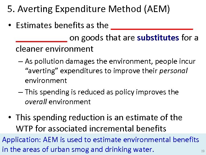 5. Averting Expenditure Method (AEM) • Estimates benefits as the ________ on goods that are substitutes for a cleaner environment – As pollution damages the environment, people incur “averting” expenditures to improve their personal environment – This spending is reduced as policy improves the overall environment • This spending reduction is an estimate of the WTP for associated incremental benefits Application: AEM is used to estimate environmental benefits in the areas of urban smog and drinking water. 19