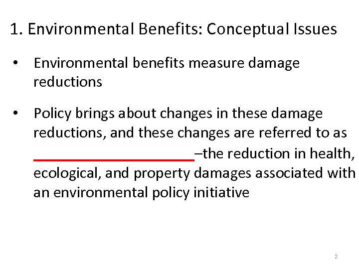 1. Environmental Benefits: Conceptual Issues • Environmental benefits measure damage reductions • Policy brings about changes in these damage reductions, and these changes are referred to as _________–the reduction in health, ecological, and property damages associated with an environmental policy initiative 2