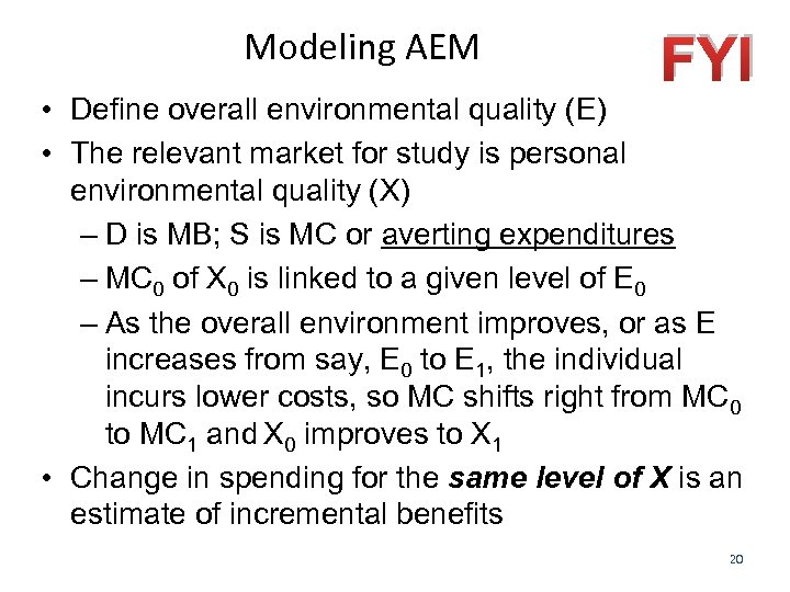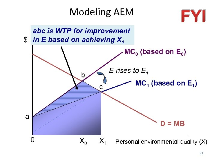Modeling AEM FYI • Define overall environmental quality (E) • The relevant market for study is personal environmental quality (X) – D is MB; S is MC or averting expenditures – MC 0 of X 0 is linked to a given level of E 0 – As the overall environment improves, or as E increases from say, E 0 to E 1, the individual incurs lower costs, so MC shifts right from MC 0 to MC 1 and X 0 improves to X 1 • Change in spending for the same level of X is an estimate of incremental benefits 20