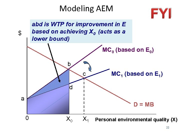 Modeling AEM FYI abc is WTP for improvement $ in E based on achieving X 1 MC 0 (based on E 0) E rises to E 1 b c MC 1 (based on E 1) d a D = MB 0 X 1 Personal environmental quality (X) 21