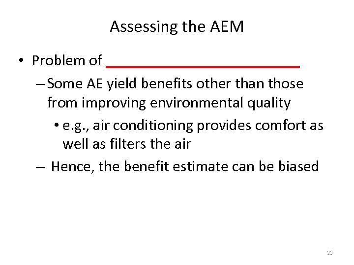 Assessing the AEM • Problem of ___________ – Some AE yield benefits other than those from improving environmental quality • e. g. , air conditioning provides comfort as well as filters the air – Hence, the benefit estimate can be biased 23