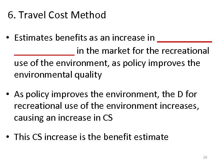 6. Travel Cost Method • Estimates benefits as an increase in ___________ in the market for the recreational use of the environment, as policy improves the environmental quality • As policy improves the environment, the D for recreational use of the environment increases, causing an increase in CS • This CS increase is the benefit estimate 24