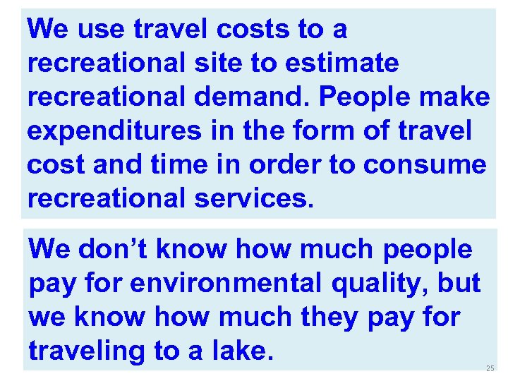 We use travel costs to a recreational site to estimate recreational demand. People make expenditures in the form of travel cost and time in order to consume recreational services. We don’t know how much people pay for environmental quality, but we know how much they pay for traveling to a lake. 25