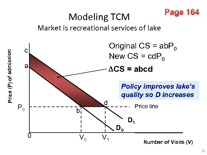 Page 164 Modeling TCM Price (P) of admission Market is recreational services of lake Original CS = ab. P 0 New CS = cd. P 0 c a CS = abcd Policy improves lake’s quality so D increases P 0 b 0 d Price line D 0 V 1 D 1 Number of Visits (V) 26