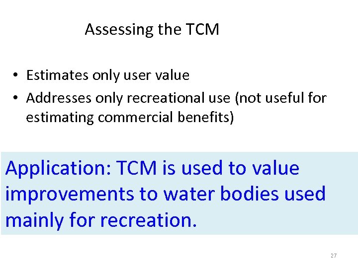 Assessing the TCM • Estimates only user value • Addresses only recreational use (not useful for estimating commercial benefits) Application: TCM is used to value improvements to water bodies used mainly for recreation. 27