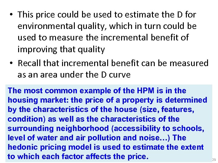 • This price could be used to estimate the D for environmental quality, which in turn could be used to measure the incremental benefit of improving that quality • Recall that incremental benefit can be measured as an area under the D curve The most common example of the HPM is in the housing market: the price of a property is determined by the characteristics of the house (size, features, condition) as well as the characteristics of the surrounding neighborhood (accessibility to schools, level of water and air pollution and noise…) The hedonic pricing model is used to estimate the extent to which each factor affects the price. 29