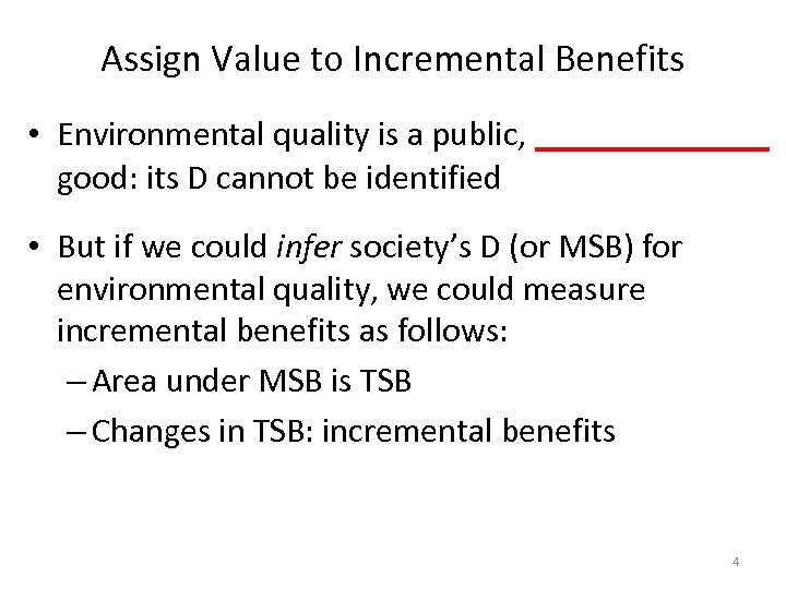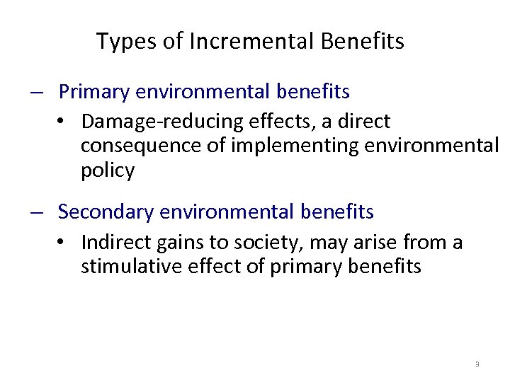 Types of Incremental Benefits – Primary environmental benefits • Damage-reducing effects, a direct consequence of implementing environmental policy – Secondary environmental benefits • Indirect gains to society, may arise from a stimulative effect of primary benefits 3