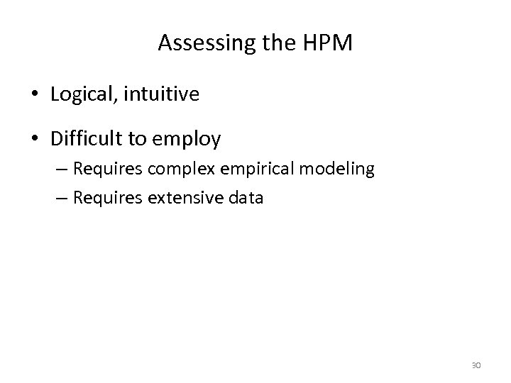 Assessing the HPM • Logical, intuitive • Difficult to employ – Requires complex empirical modeling – Requires extensive data 30