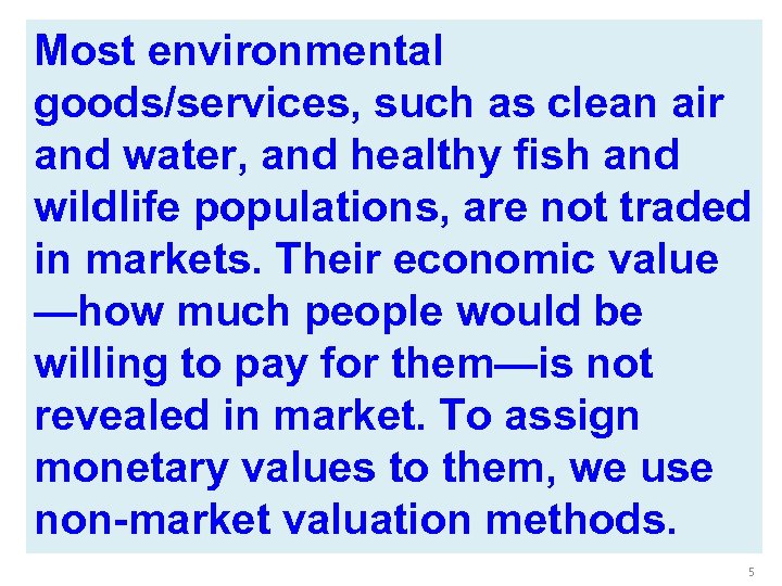 Most environmental goods/services, such as clean air and water, and healthy fish and wildlife populations, are not traded in markets. Their economic value —how much people would be willing to pay for them—is not revealed in market. To assign monetary values to them, we use non-market valuation methods. 5