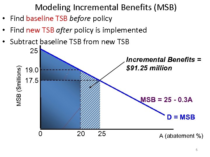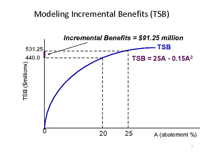 Modeling Incremental Benefits (MSB) • Find baseline TSB before policy • Find new TSB after policy is implemented • Subtract baseline TSB from new TSB MSB ($millions) 25 Incremental Benefits = $91. 25 million 19. 0 17. 5 MSB = 25 - 0. 3 A D = MSB 0 20 25 A (abatement %) 6