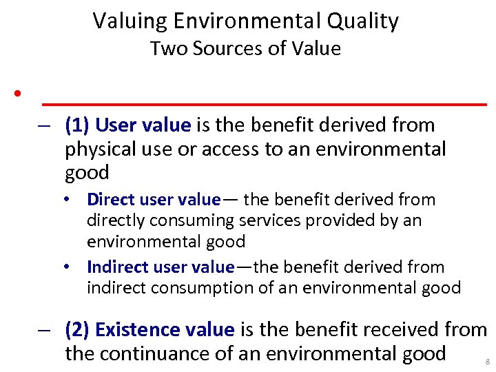 Valuing Environmental Quality Two Sources of Value • __________________ – (1) User value is the benefit derived from physical use or access to an environmental good • Direct user value— the benefit derived from directly consuming services provided by an environmental good • Indirect user value—the benefit derived from indirect consumption of an environmental good – (2) Existence value is the benefit received from the continuance of an environmental good 8