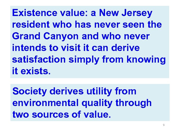 Existence value: a New Jersey resident who has never seen the Grand Canyon and who never intends to visit it can derive satisfaction simply from knowing it exists. Society derives utility from environmental quality through two sources of value. 9