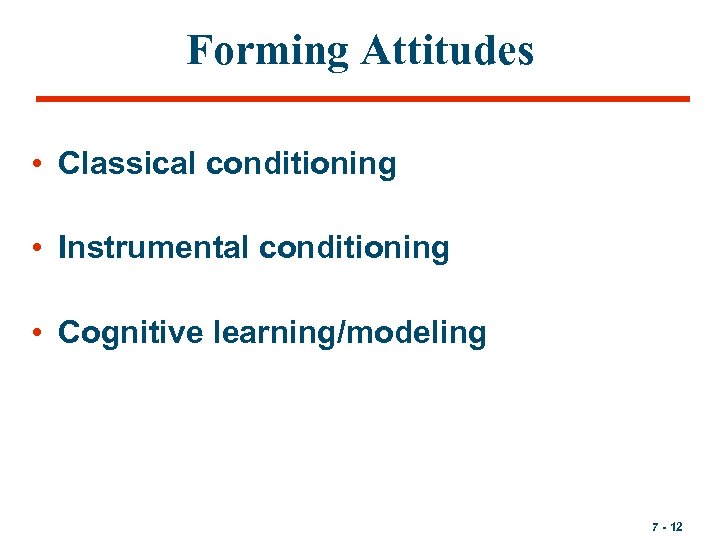 Forming Attitudes • Classical conditioning • Instrumental conditioning • Cognitive learning/modeling 7 - 12