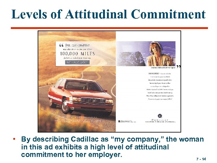 Levels of Attitudinal Commitment • By describing Cadillac as “my company, ” the woman in this ad exhibits a high level of attitudinal commitment to her employer. 7 - 14