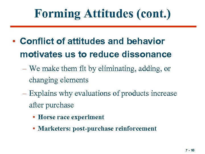 Forming Attitudes (cont. ) • Conflict of attitudes and behavior motivates us to reduce dissonance – We make them fit by eliminating, adding, or changing elements – Explains why evaluations of products increase after purchase • Horse race experiment • Marketers: post-purchase reinforcement 7 - 16