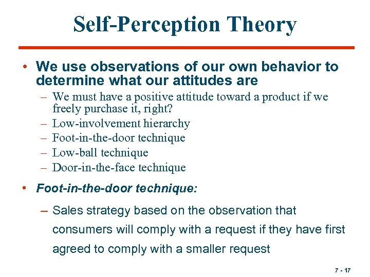 Self-Perception Theory • We use observations of our own behavior to determine what our attitudes are – We must have a positive attitude toward a product if we freely purchase it, right? – Low-involvement hierarchy – Foot-in-the-door technique – Low-ball technique – Door-in-the-face technique • Foot-in-the-door technique: – Sales strategy based on the observation that consumers will comply with a request if they have first agreed to comply with a smaller request 7 - 17