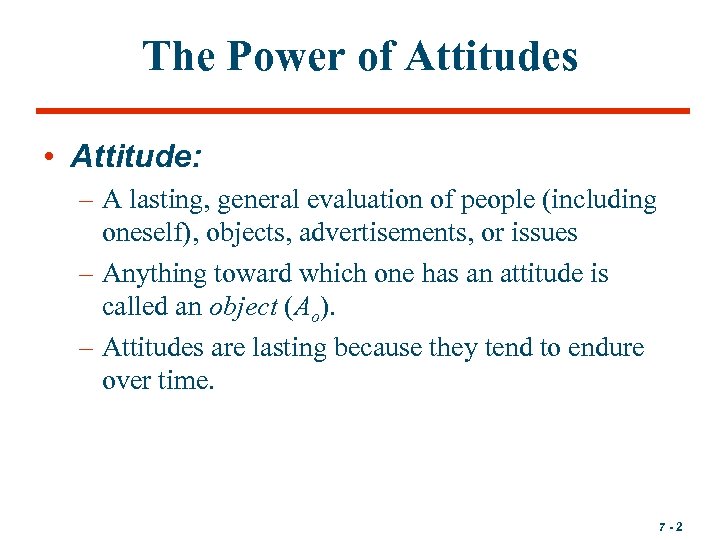 The Power of Attitudes • Attitude: – A lasting, general evaluation of people (including oneself), objects, advertisements, or issues – Anything toward which one has an attitude is called an object (Ao). – Attitudes are lasting because they tend to endure over time. 7 -2