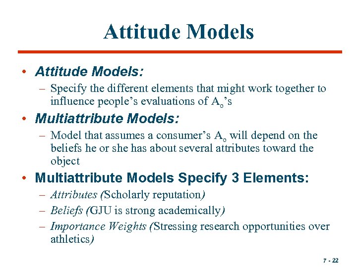 Attitude Models • Attitude Models: – Specify the different elements that might work together to influence people’s evaluations of Ao’s • Multiattribute Models: – Model that assumes a consumer’s Ao will depend on the beliefs he or she has about several attributes toward the object • Multiattribute Models Specify 3 Elements: – Attributes (Scholarly reputation) – Beliefs (GJU is strong academically) – Importance Weights (Stressing research opportunities over athletics) 7 - 22