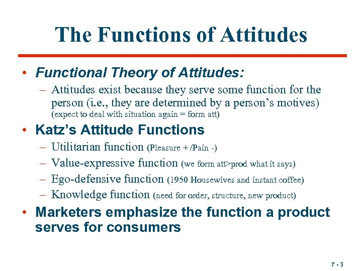 The Functions of Attitudes • Functional Theory of Attitudes: – Attitudes exist because they serve some function for the person (i. e. , they are determined by a person’s motives) (expect to deal with situation again = form att) • Katz’s Attitude Functions – – Utilitarian function (Pleasure + /Pain -) Value-expressive function (we form att>prod what it says) Ego-defensive function (1950 Housewives and instant coffee) Knowledge function (need for order, structure, new product) • Marketers emphasize the function a product serves for consumers 7 -3